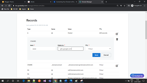 Just stay with your GoDaddy account and open your blogger site in another browser. We need to work on both parallelly.